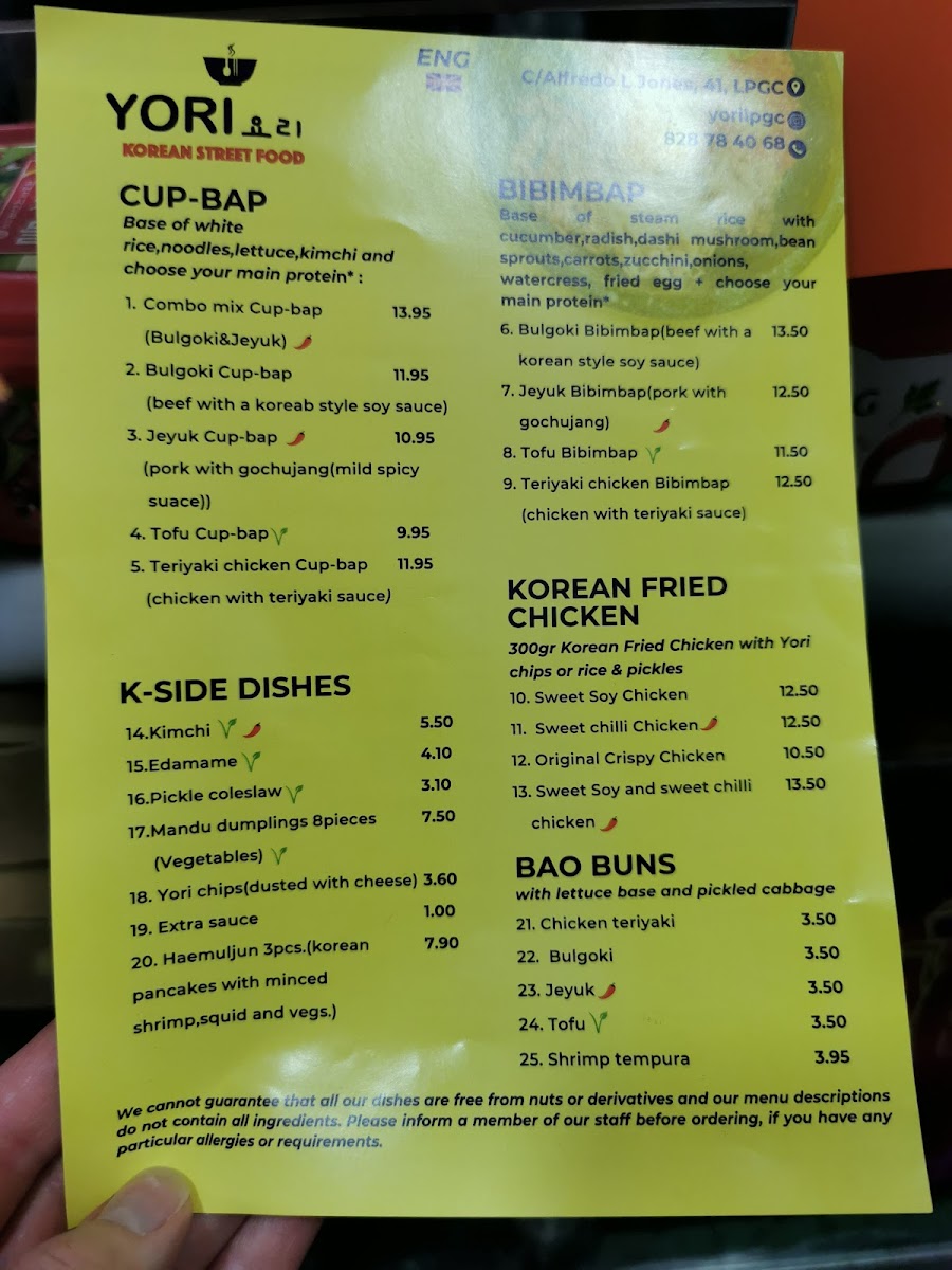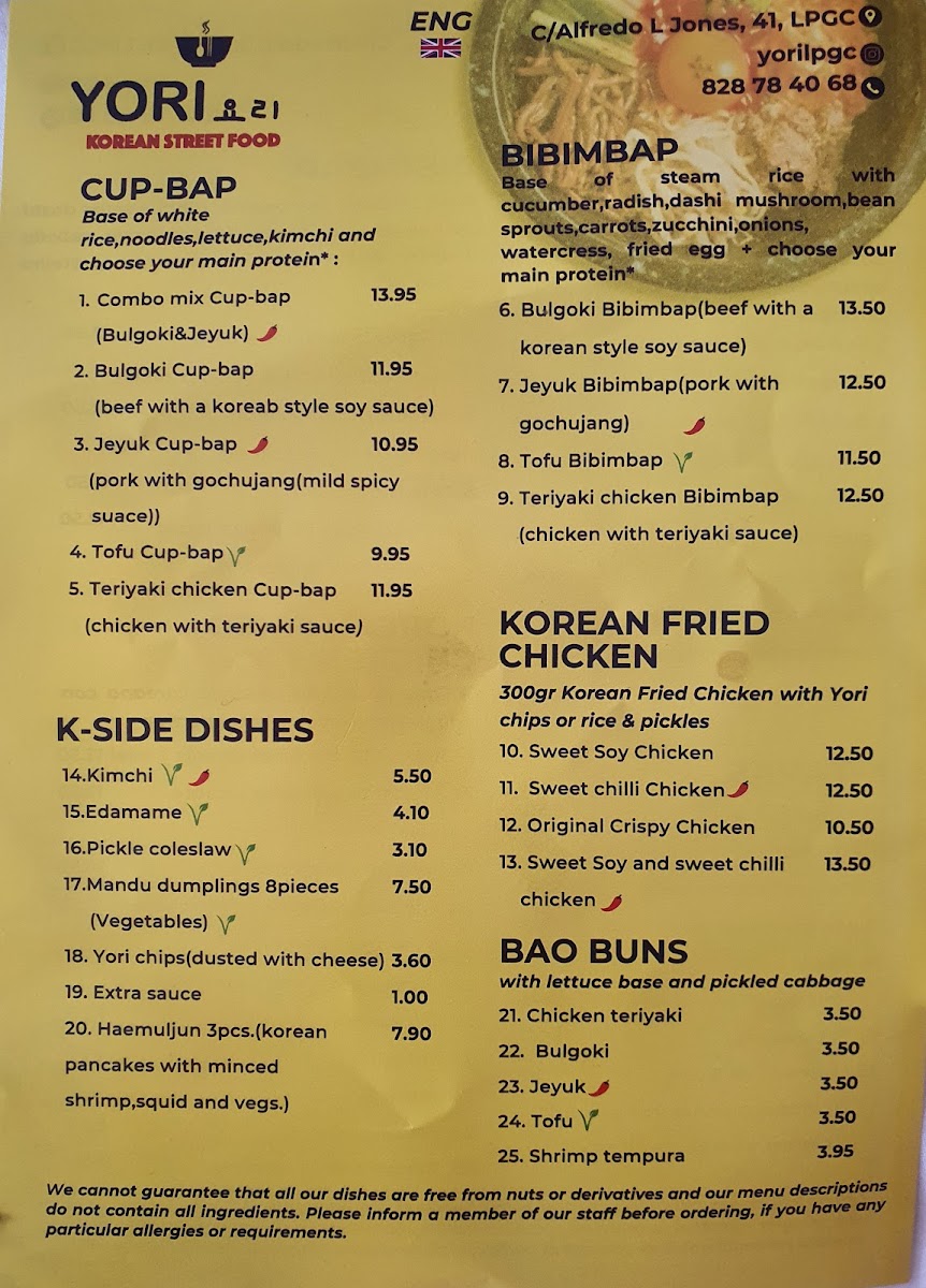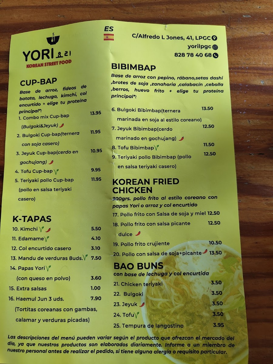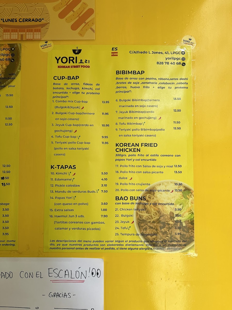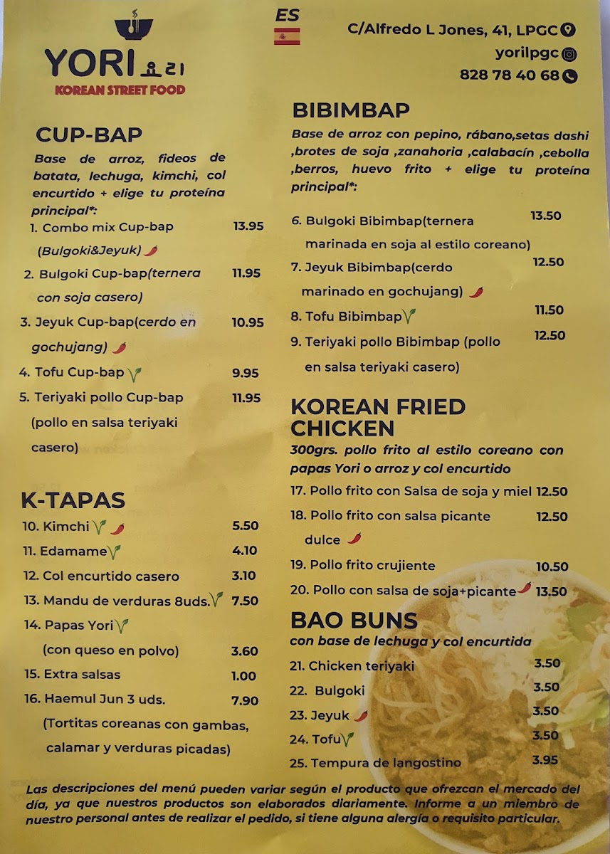 Introducing Yori Las Palmas, a delightful takeout gem nestled in the vibrant heart of Las Palmas de Gran Canaria. This culinary hotspot specializes in authentic Korean flavors, featuring a menu brimming with tantalizing options. Among the standout offerings are the renowned Cup-Bap dishes, including the Teriyaki Pollo and Bulgoki Cup-Bap, each meticulously crafted with steamed rice, sweet potato noodles, kimchi, and refreshing veggies. The K-Side Tapas are not to be overlooked either, with the crispy Papas Yori and savory Haemul Jun showcasing the rich textures and tastes of Korean cuisine.