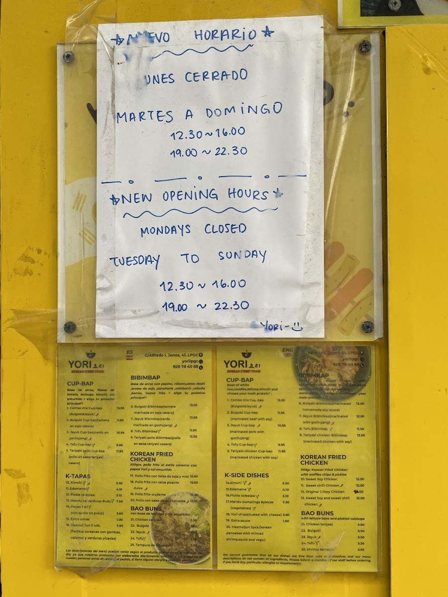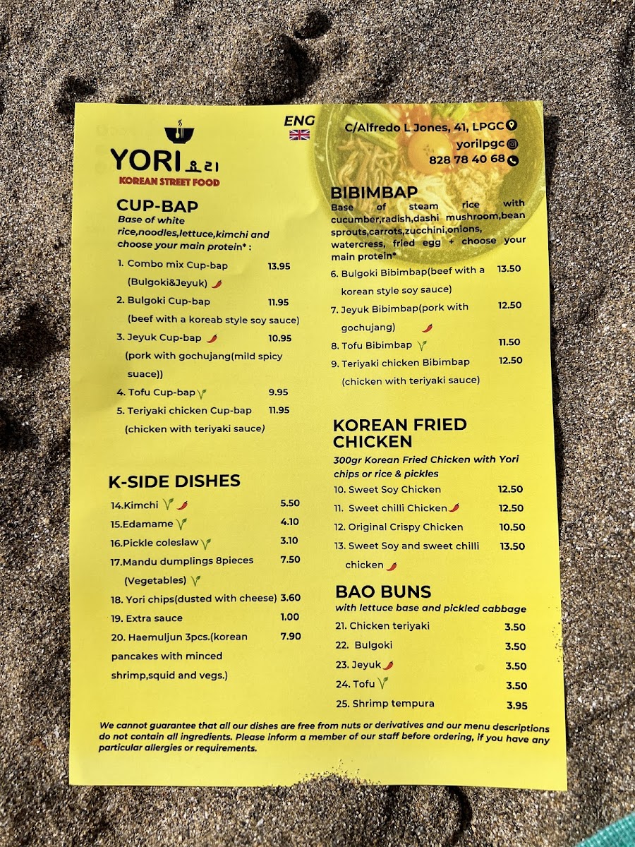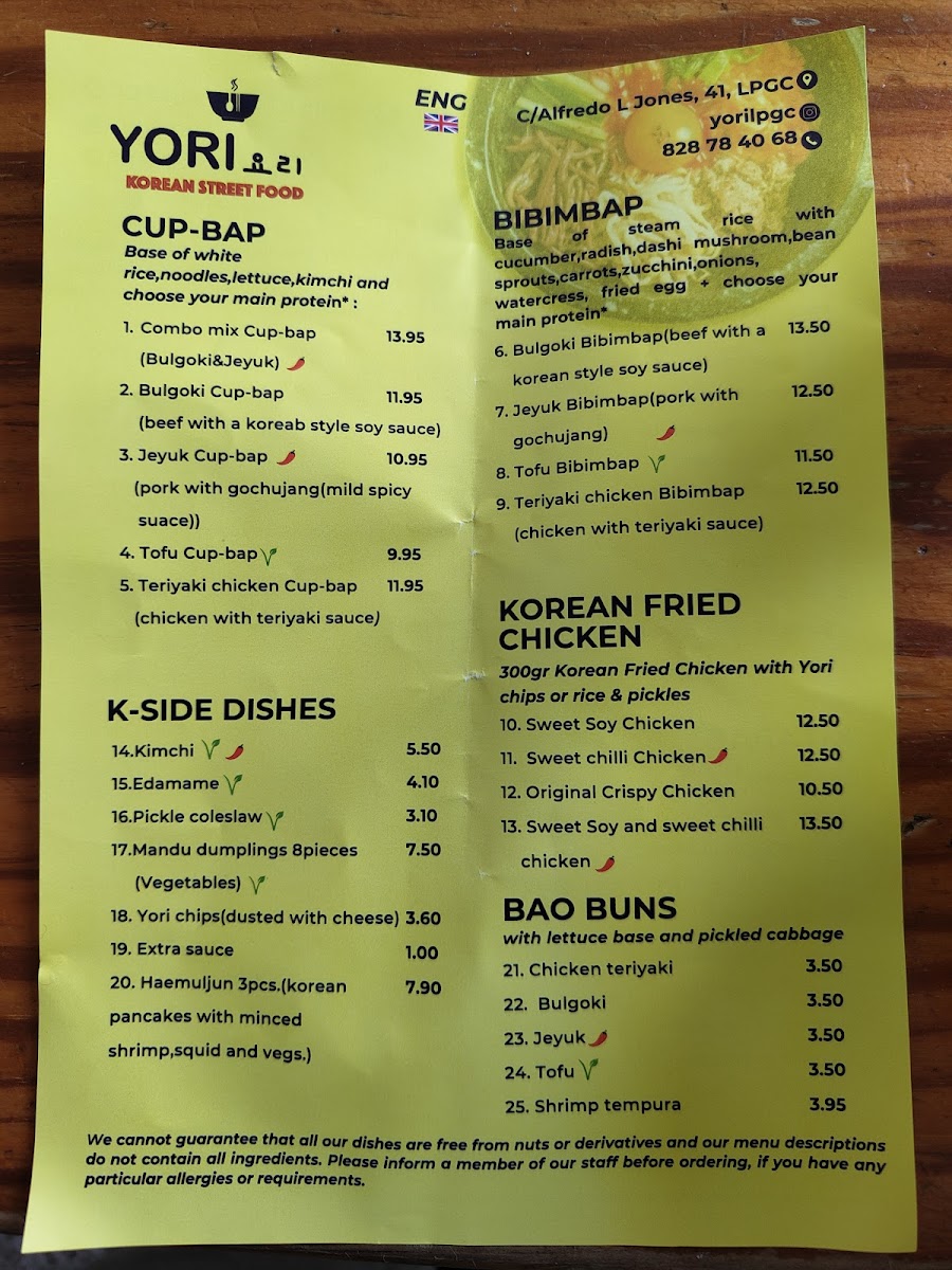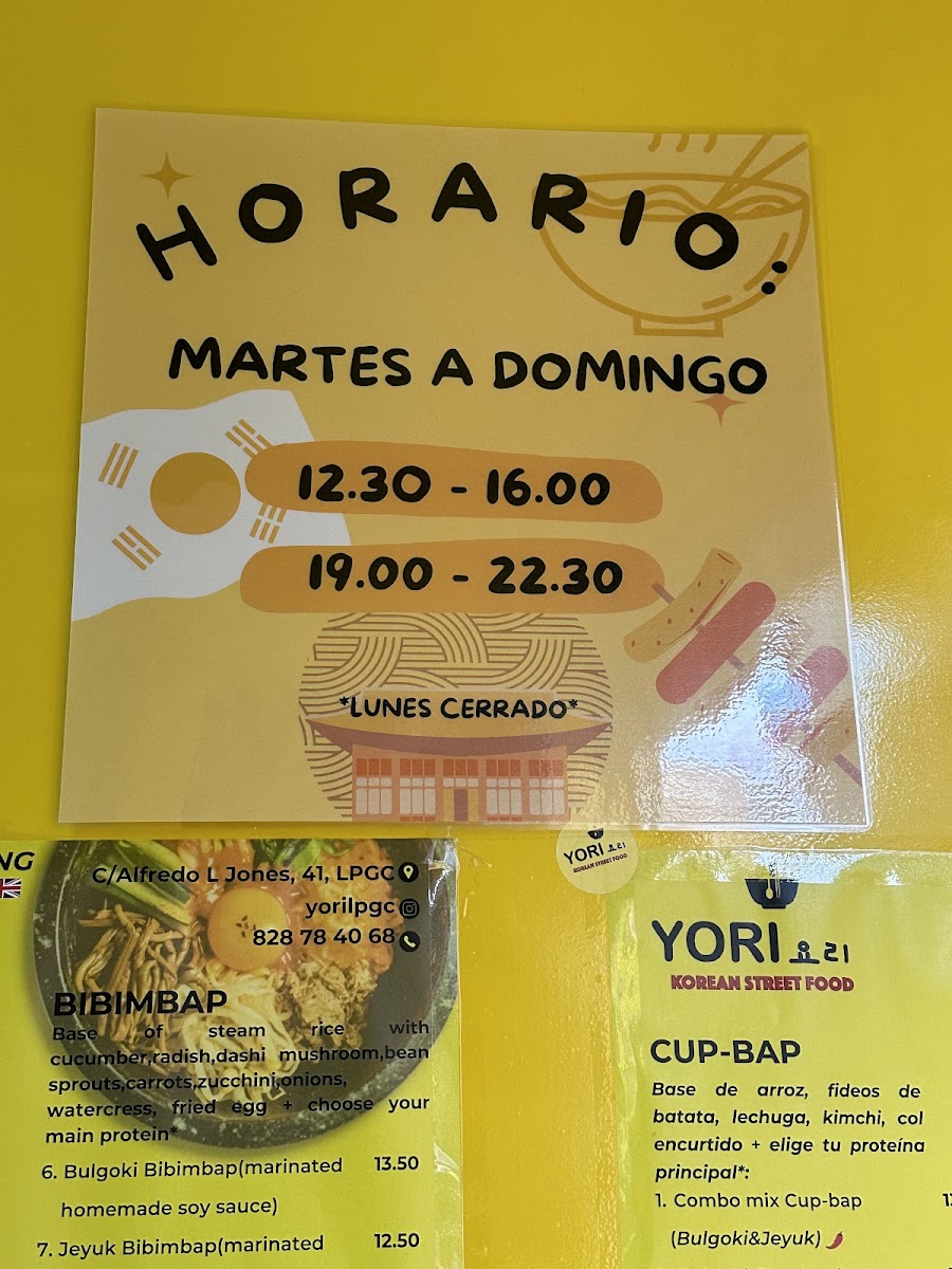 Introducing Yori Las Palmas, a delightful takeout gem nestled in the vibrant heart of Las Palmas de Gran Canaria. This culinary hotspot specializes in authentic Korean flavors, featuring a menu brimming with tantalizing options. Among the standout offerings are the renowned Cup-Bap dishes, including the Teriyaki Pollo and Bulgoki Cup-Bap, each meticulously crafted with steamed rice, sweet potato noodles, kimchi, and refreshing veggies. The K-Side Tapas are not to be overlooked either, with the crispy Papas Yori and savory Haemul Jun showcasing the rich textures and tastes of Korean cuisine.